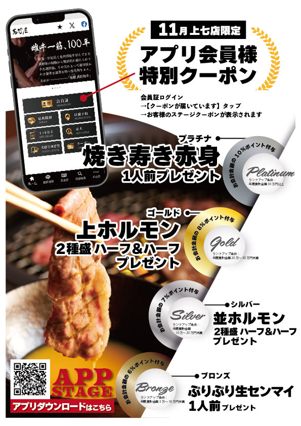 いつもご利用くださる皆様にお喜び頂きたく、会員ステージ【ブロンズ】【シルバー】【ゴールド】【プラチナ】のみなさまへ下記店舗にてサービス商品をご提供✨