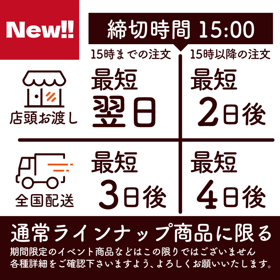 ※送り先が沖縄、北海道、離島などの場合は、最短日は+1〜2日(4〜5日後)となります。